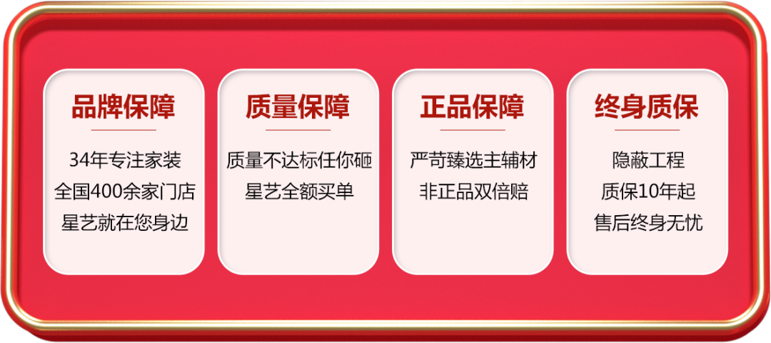 全國聯保,售后無憂。裝修選星藝,4大承諾,品質保障。放心裝,安心住。